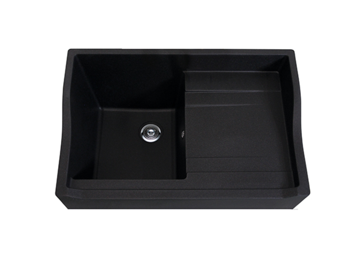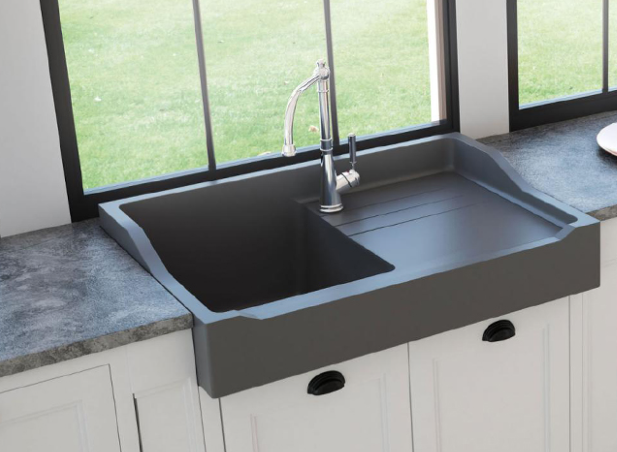 Fregadero de cocina de estilo Vintage, fabricado en granito por Chambord France, con una cubeta y escurridor. Acabados disponibles granito: blanco, negro y gris titanio.